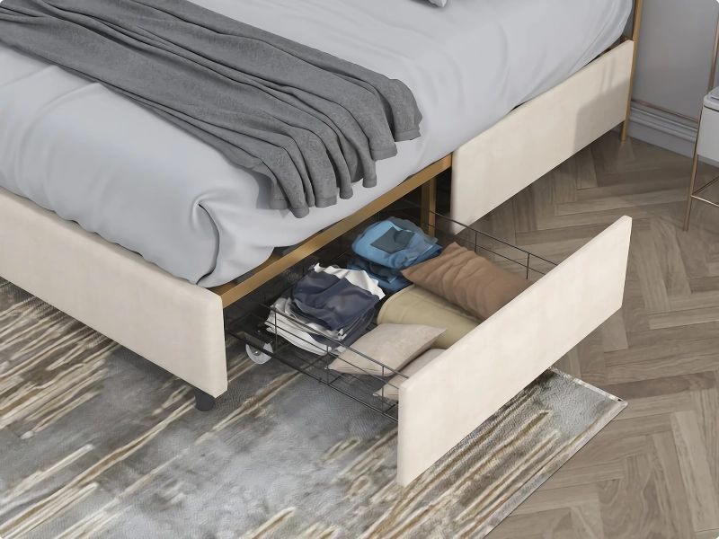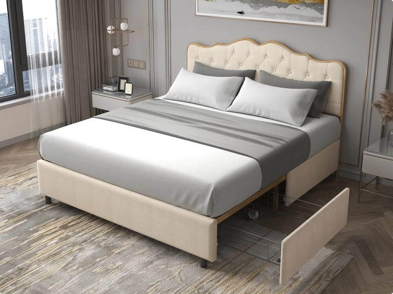 I can't get over how much I love my new bed. The fabric is luxurious, the design is sleek, and the storage drawers are incredibly useful. It's completely transformed my bedroom into a modern, cozy space