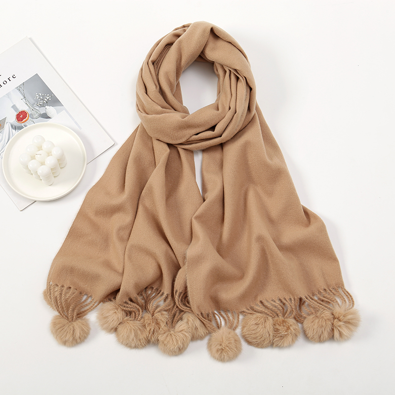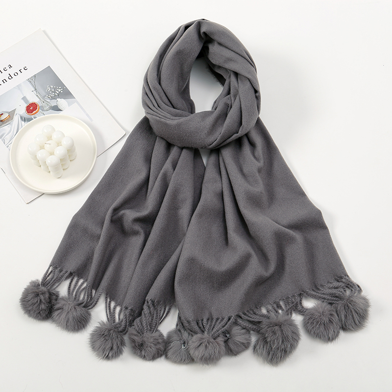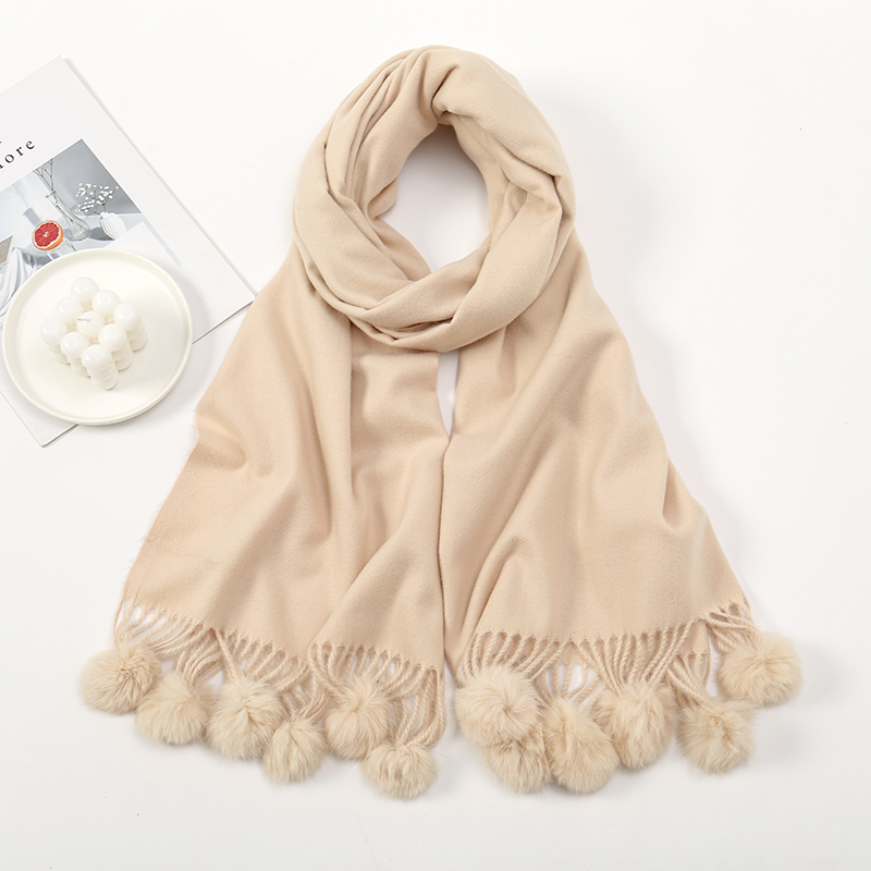 Crafted from high-quality cashmere, this scarf offers unmatched softness and warmth. The addition of rabbit fur pom poms elevates the design, making it both fashionable and functional. Measuring over 69 inches in length, it provides ample coverage, allowing you to drape, wrap, or knot it in various stylish ways. The solid color ensures it complements any outfit, while the oversized design makes it suitable for use as both a scarf and a shawl.