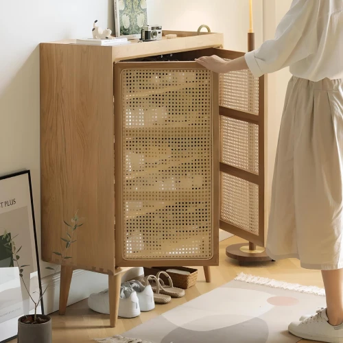 I love how this shoe cabinet combines natural rattan weave with solid oak for a durable piece. It's not just furniture; it's a lifestyle upgrade, keeping my shoes organized and my entryway tidy.