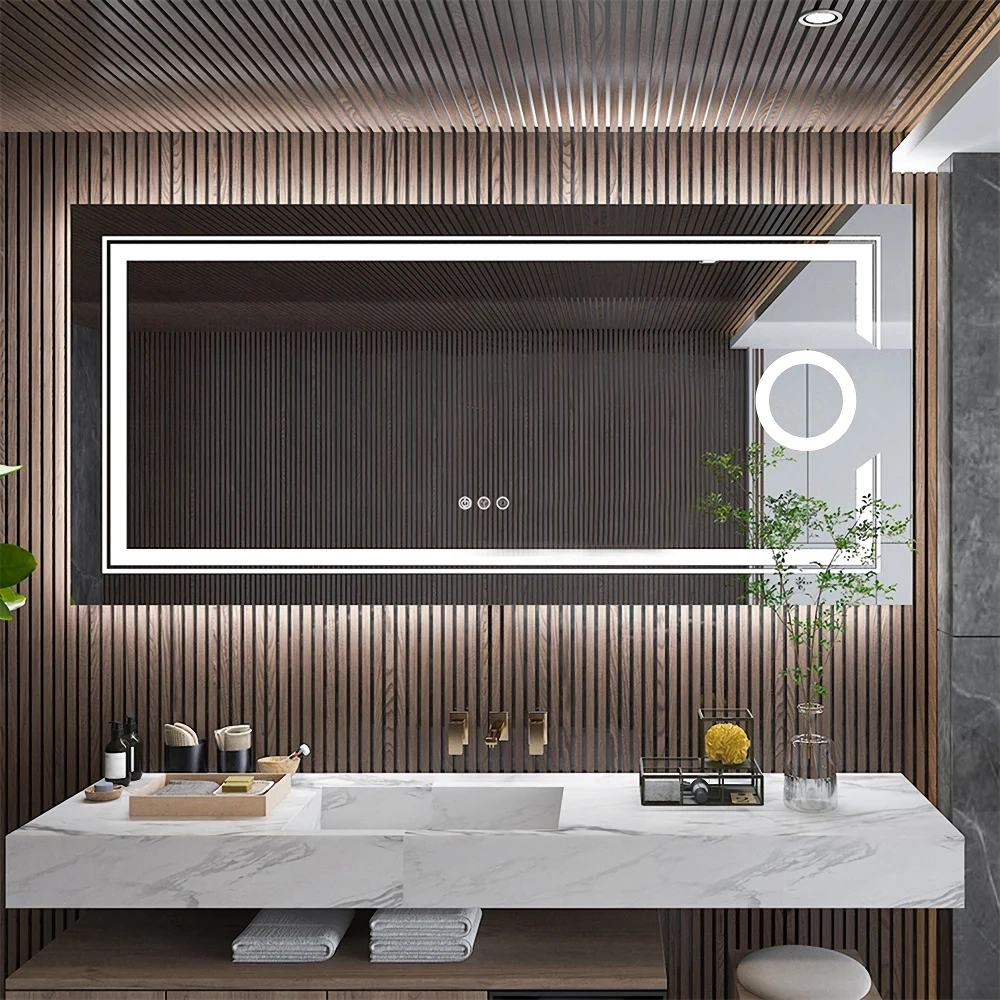 Let me take you through a detailed journey with my new frameless LED lighted bathroom mirror, which has truly revolutionized my mornings and made my bathroom feel more like a luxury spa. First off, the installation process was a breeze, and the moment I switched it on, my bathroom was transformed. The light emitted from this mirror is nothing short of spectacular, casting a clarity over my space that I didn't know was missing. 🌟 The 3X magnification feature is what stands out the most for me. As someone who pays close attention to the details when applying makeup, this feature ensures that every eyeliner wing is sharp and every pore is covered. It's like having a professional setup at home! What's more, the dual lighting source eliminates any frustration I used to face with shadows, making it easier to see every angle of my face without having to move around. Now, let's talk about the anti-fog function. There's something truly magical about stepping out of a hot, steamy shower to a clear mirror, ready for use. No more wiping down with towels or waiting for the fog to clear. This mirror stays pristine, which not only saves time but also adds a touch of convenience to my routine. But the benefits don't stop there. The energy efficiency of this mirror is a significant plus. Knowing that it has a lifespan of 50,000 hours gives me peace of mind that this is an eco-friendly choice. It's reassuring to know I'm making a sustainable decision without compromising on quality or functionality.