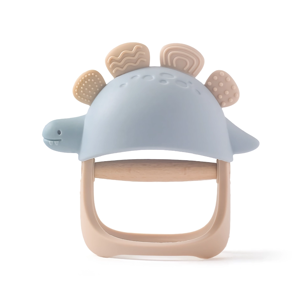 Its soft silicone material is gentle on your baby’s gums, while the natural wooden ring provides a firm grip for little hands. The teether’s playful dinosaur shape makes it easy for babies to hold and chew on, offering soothing relief from teething discomfort.